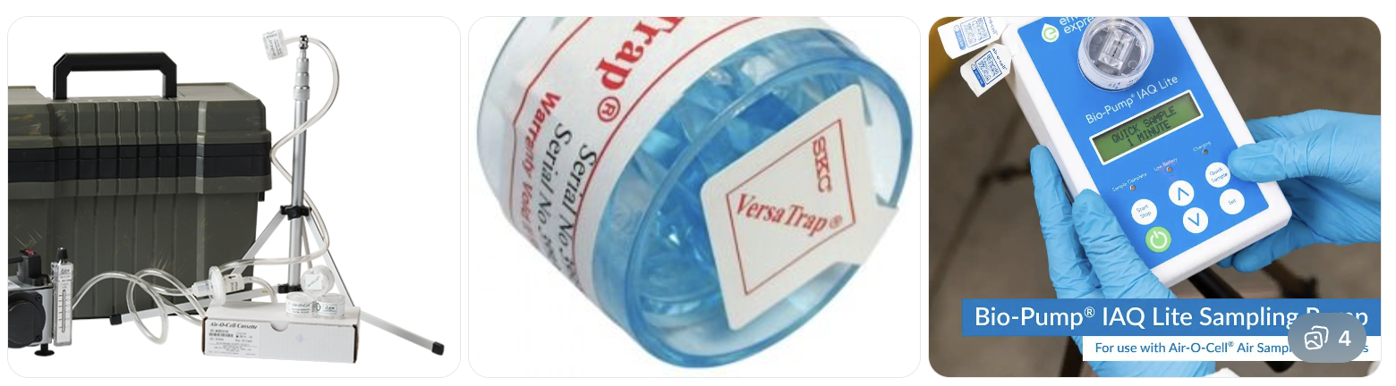 Air sampling for mold is performed using a calibrated air pump and a spore trap cassette — and this same sample also captures airborne particulates present in the air at the time of testing.